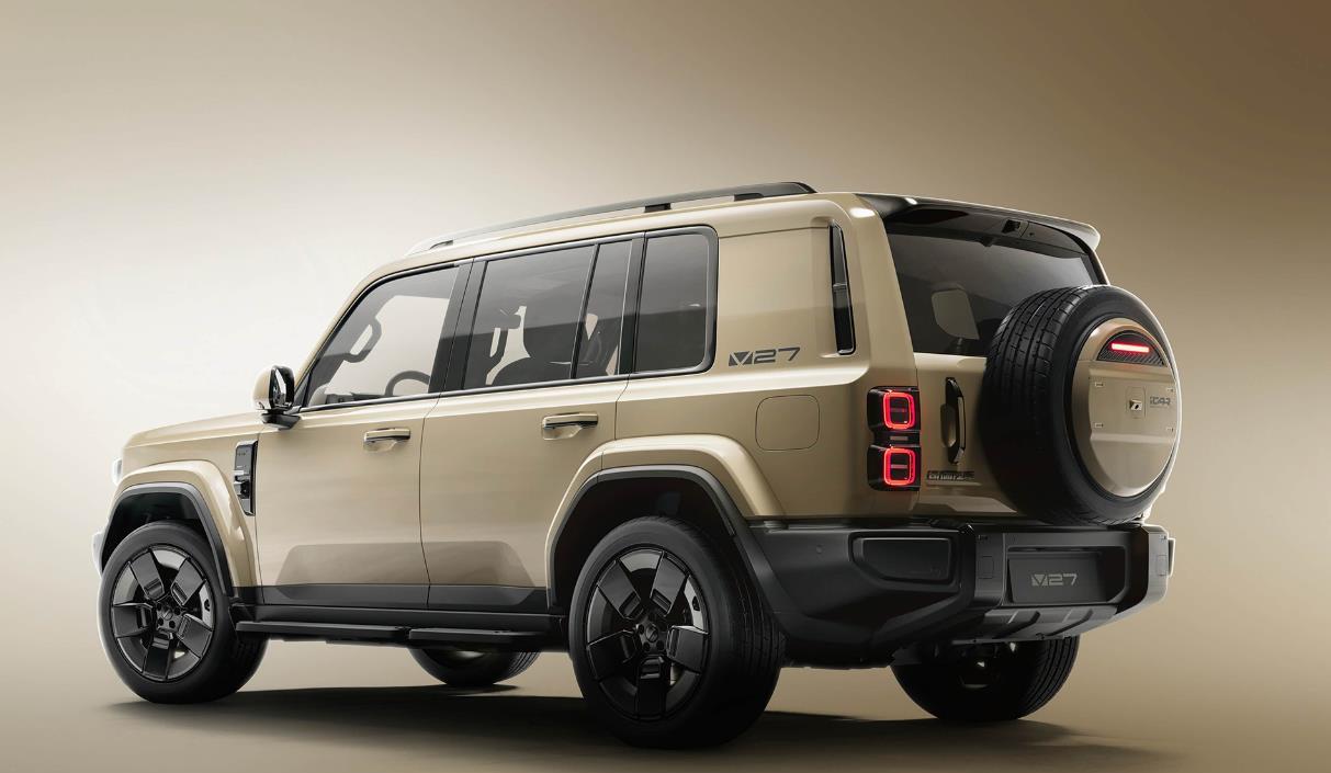 车尾部分,iCAR V27延续硬派越野车常见的方形LED尾灯组设计,灯圈发光元素简洁立体,熏黑设计赋予外形年轻气息,与集成在外挂备胎罩盖上的高位刹车灯相辅相成,既强调设计简洁大气,也关注用户群体的个性化需求表达。尾门采用侧开式设计,地台相对传统家用SUV偏高,后保险杠尺寸规格与前保险杠接近,结实程度丰富了整车的越野气息。尺寸方面,新车长宽高来到4909(小书包版)/5055(备胎版)x1976x1855/1894(带行李架)mm,轴距2910mm。